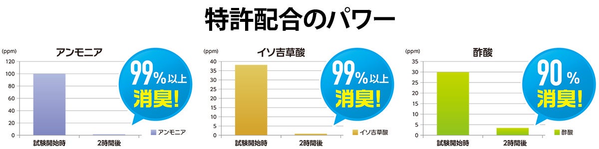 特許配合のパウダーにより、汗臭(酢酸)に対する消臭効果が1.5倍*¹に!(当社従来品比)