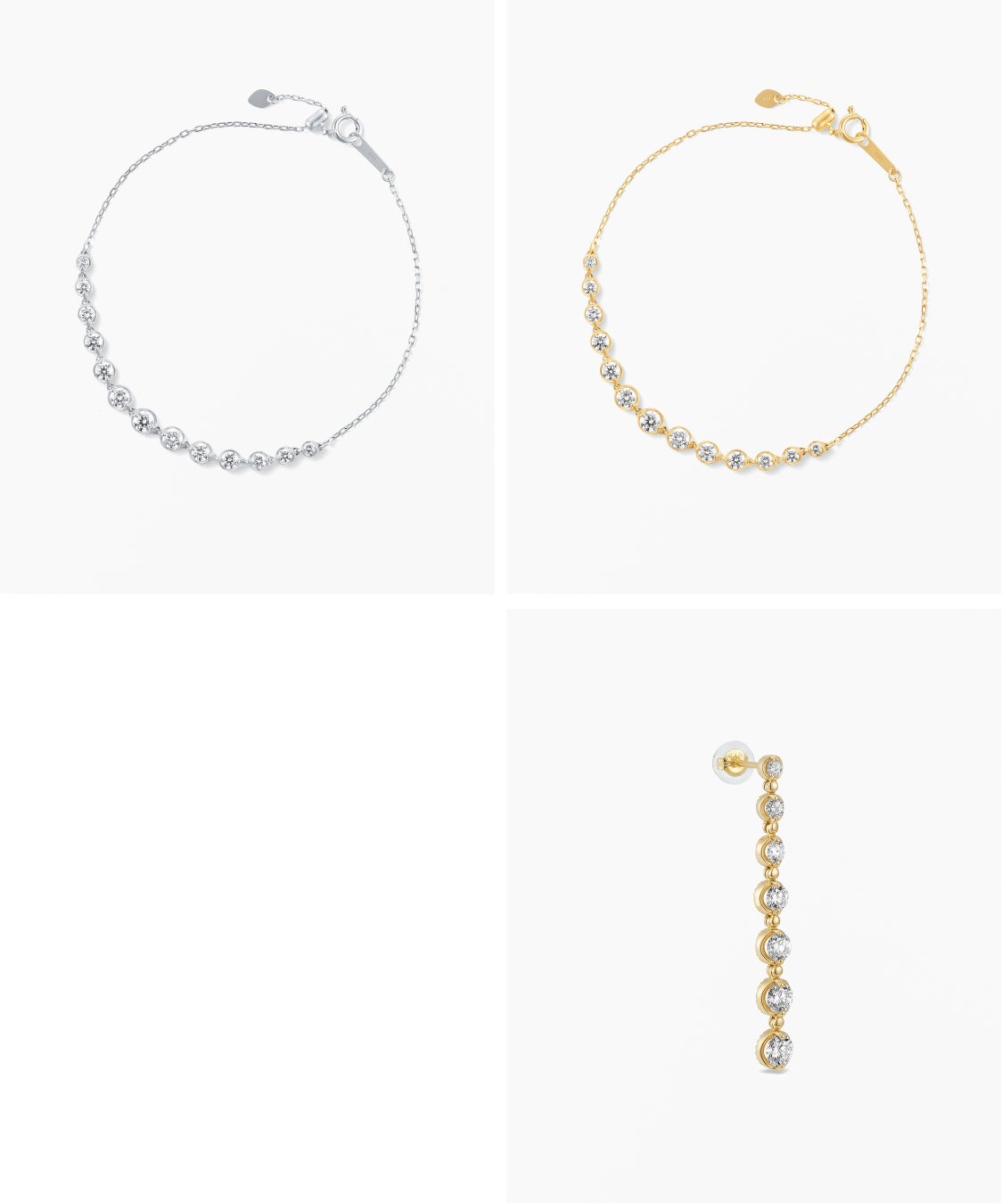 動きに合わせてしなやかに輝きを放つテニスブレスレットとピアス。一つひとつの石座やジョイントパーツに至るまで、職人の精巧な技を施しました。唯一無二のなめらかさが、揺るぎない普遍的な魅力を生み出します。また、重ね付けにも適したデザインで、世代を超えて長くご愛用いただけます。