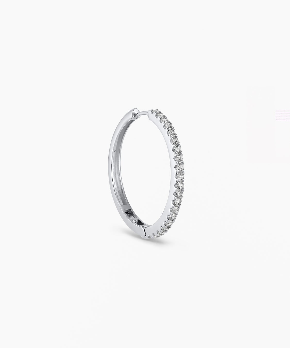 開閉式フープピアス(右画像)は、わずかに重心を下げたデザインが洗練された安定感を実現。リバーシブル仕様で、ダイヤモンド側と地金側の前後を変えて身につけられます。パヴェが連なるスタッドピアスは、地金に膨らみと適度な重量感を持たせ、エレガンスと存在感を演出しました。