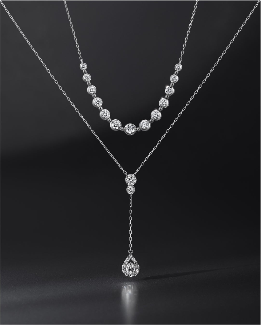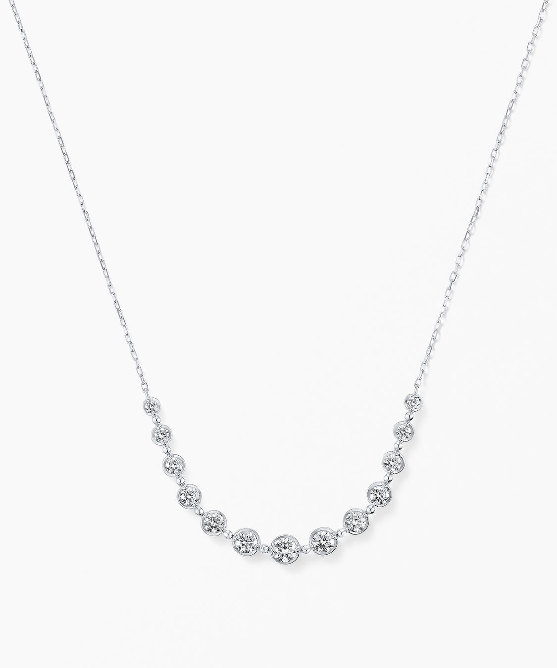 定番品こそこだわりたいというお客様の声に応えた、ミニマルな美が際立つグラデーションタイプのダイヤモンドネックレス。独自設計の爪留めで輝きを最大限に引き出したダイヤモンドを、横並びではなく一粒ずつ独立してセッティング。肌に沿うような柔らかなラインを描きます。さらに、両端に向かってグラデーションを描くように石のサイズを調整し、流麗で上品な美しさを演出。スライド式チェーンによる長さ調整機能も備えた一品です。