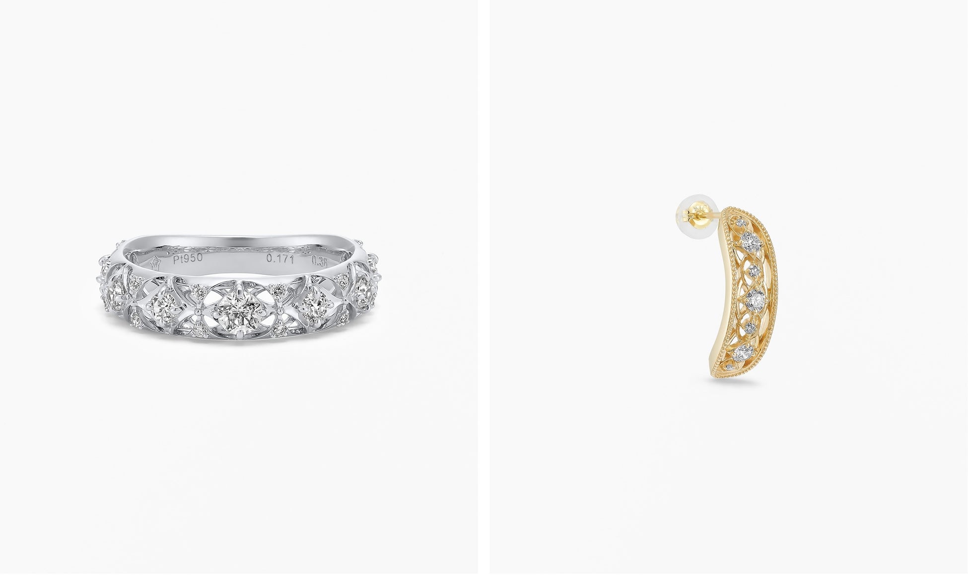 リングは、オリジナルのプレミアムカット“Wish upon a star®”ダイヤモンドを贅沢に使用。エタニティーリングは、大小のダイヤモンドを巧みに組み合わせて奥行きのある輝きを表現しました。極小の爪留めと精密な石留め技術が、華やかさを最大限に引き出します。三日月型のピアスは透かし模様で抜け感を与え、モダンで洗練されたムードをまとわせました。