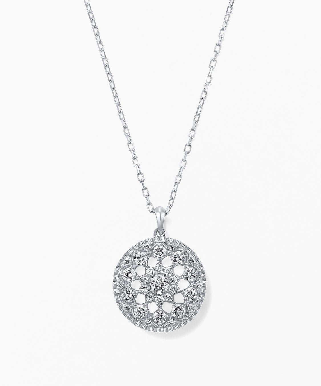 複雑な透かし模様が織りなす奥行きと煌めきが特徴のネックレス。複数の中空構造パーツを組み合わせることで光を巧みに反射し、繊細でグラフィカルな模様を引き立てます。リバーシブル仕様で裏面にもこだわりの意匠を施し、随所に技巧を凝らしました。クラシカルな趣にモダンなエッセンスを加えた造形は、幅広いスタイルに自然と調和します。