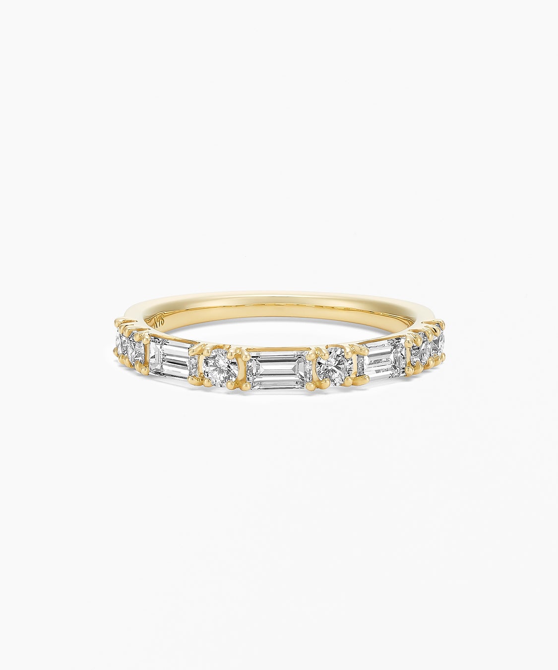 バゲットカットのリング(右画像)は、専属バイヤーの卓越した目利きと、職人の技術による精緻な石合わせで端正な仕上がりに。また、極小ダイヤを敷き詰めたパヴェリングは、配置に合わせて石のサイズを細かく変え、丸みを帯びた柔らかなフォルムを作り上げました。