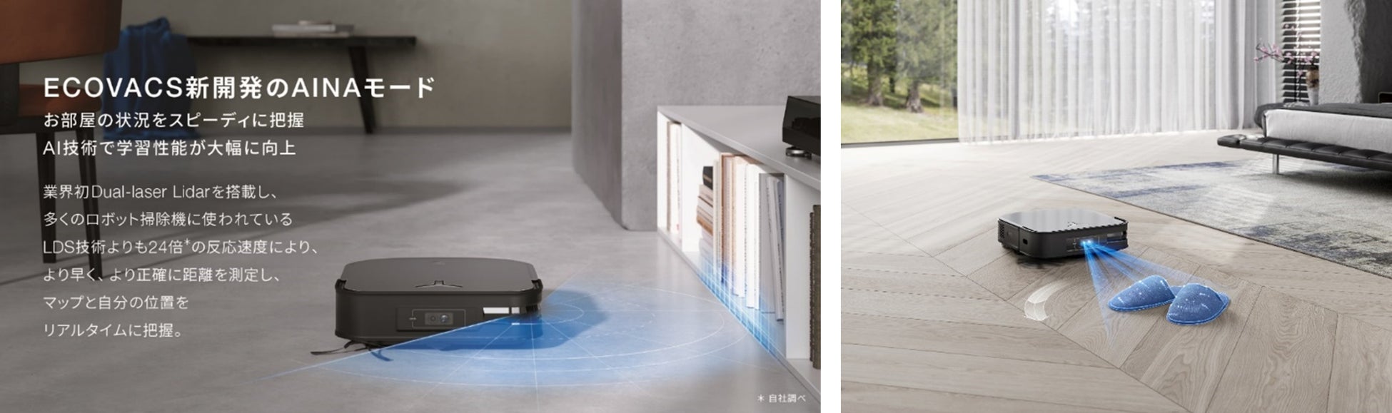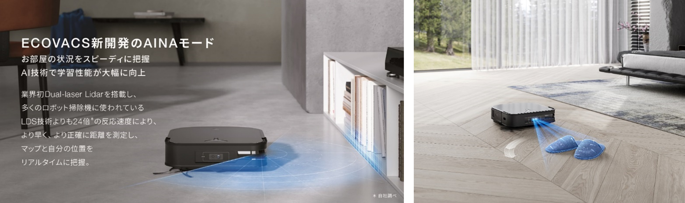 また、多くのロボット掃除機に使われているLDS技術よりも反応速度が24倍速く、さらに、AINAモードと組み合わせることで、より正確に部屋の間取り、家具の位置、部屋の中の自分の位置までもリアルタイムに把握することが可能となり、死角のないマッピング技術となっています。