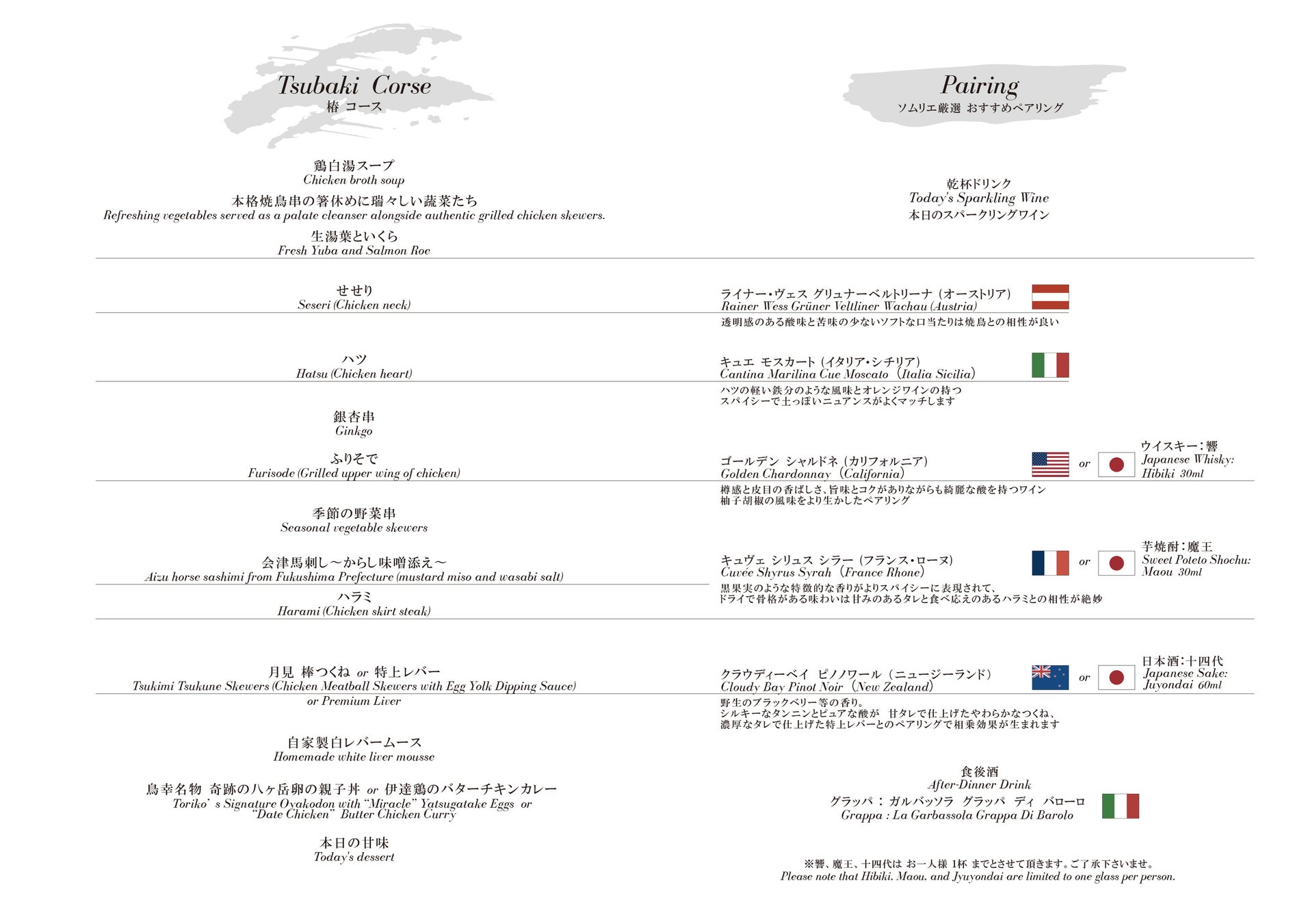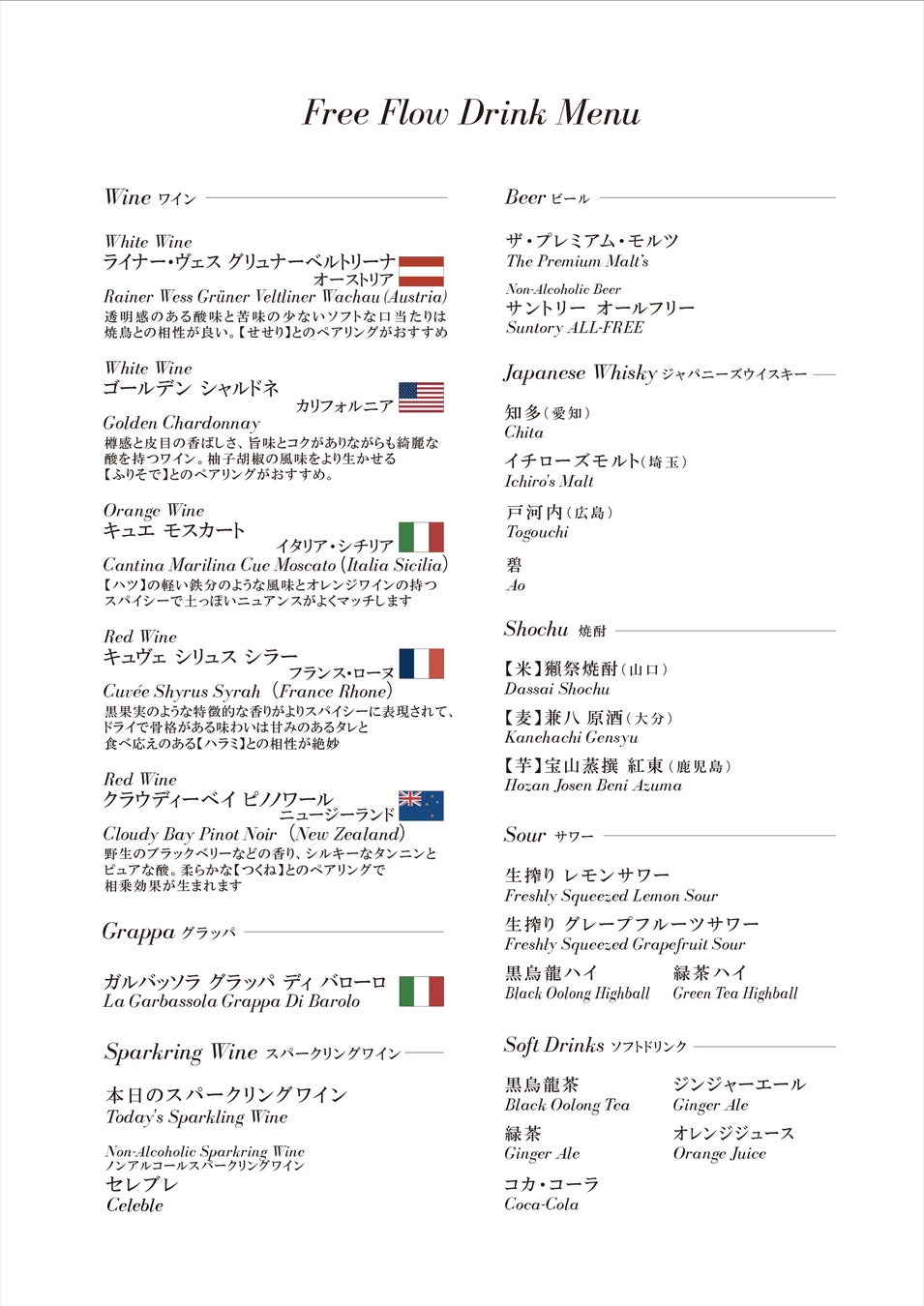 焼き鳥とワインのマリアージュは当店の特長で、創業当初からソムリエがセレクトしたワインとのマリアージュが多くのお客様の支持をいただいてきました。今回、焼鳥とワインのペアリングはもちろんのこと、ワイン以外の国酒をメニューに合わせて選択できるペアリングコースを企画しました。国酒として日本酒の「十四代」、焼酎の「魔王」をペアリングすることで焼鳥とのマリアージュをよりお楽しみいただけます。また、ペアリングコースでは飲み足りないご意見も多いことから、気兼ねなくお食事をお楽しみいただくためにペアリングするワインを含めてお酒はフリーフローでご注文いただけます。もちろん、アルコール以外のノンアルコールドリンクも充実させております。