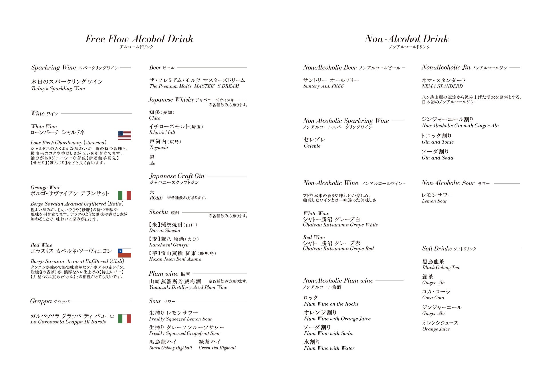 『鳥幸』は、多様な飲み方が浸透し、スマドリという言葉も認知されている今、親しい人や大切なお客様とのお食事や飲み会をより充実させるために、従来実施してこなかったフリーフローを新たに導入致します。凛とした和の世界観がコンセプトのジャズが流れる店内で落ち着いて焼鳥を楽しむスタイルの『鳥幸』では、いわゆる宴会での飲み放題はブランドコンセプトに合わないことから、飲み放題を実施しておりません。一方で落ち着いた大人の空間で、気兼ねなくお酒を楽しみたいご要望も多いことから、今回、いわゆる居酒屋の飲み放題ではなく、オレンジワインを含む厳選したワイン、著名なウィスキーや焼酎を取り揃えることで、大人がおしゃれで少しリッチにお酒を楽しむことができるフリーフローを企画致しました。アルコール・ノンアルコールと選べる乾杯用のスパークリングだけでなくノンアルコールドリンクを充実させることで多様な飲み方にも対応し、集う方全員がお楽しみいただけるフリーフローをぜひお楽しみください。