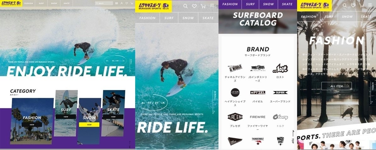 ムラサキスポーツは今年、創業50周年を迎えます。50周年を機にオンラインストアを刷新、アクションスポーツの総合サイトとしてグランドオープンいたします。新たなオンラインストアでは、ムラサキスポーツの50年にわたる歴史と経験と、全国で約150にも上る実店舗の利点を活用して、サーフィン・スノーボード・スケートボード等のアクションスポーツアイテムやファッション全般の品揃えを拡充し、アクションスポーツに関する情報の充実に注力してまいります。