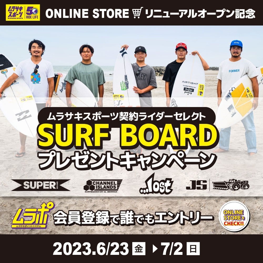 そして、ムラサキスポーツ契約ライダーがセレクトした有名ブランドのサーフボード5本が当たる誰でもエントリーできる抽選会も開催予定です。詳しくはキャンペーンサイトをご確認ください。