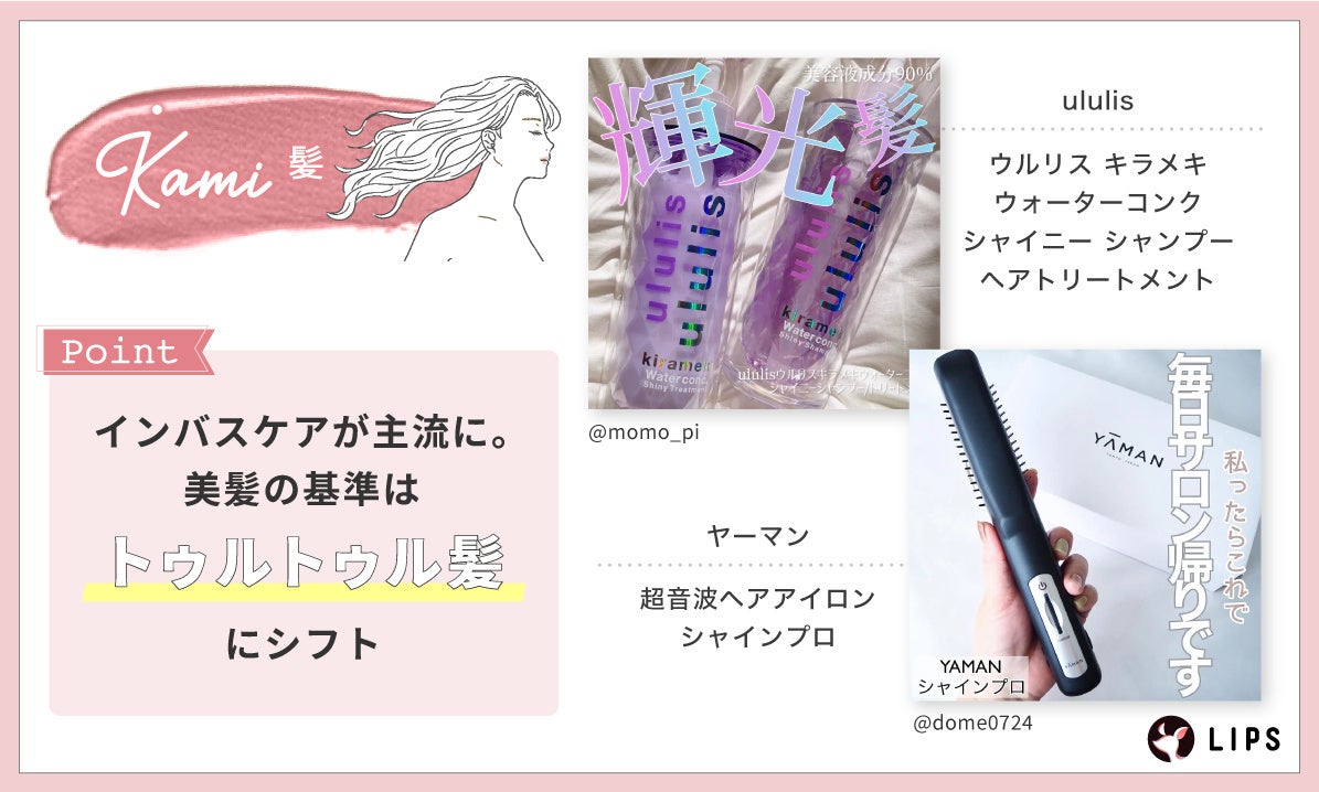 - 3、【髪】3拍子そろったトゥルトゥル髪へ。インバスケアの需要がアップ!
