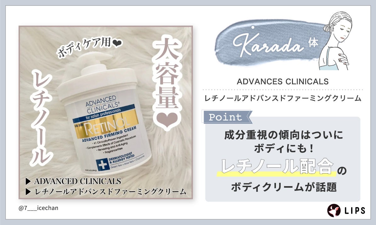 例えば、LIPSボディクリームランキング第6位(2023年3月上旬時点)のADVANCED CLINICALS『レチノールアドバンスドファーミングクリーム』は、レチノール配合のボディクリームとして話題を集めています。