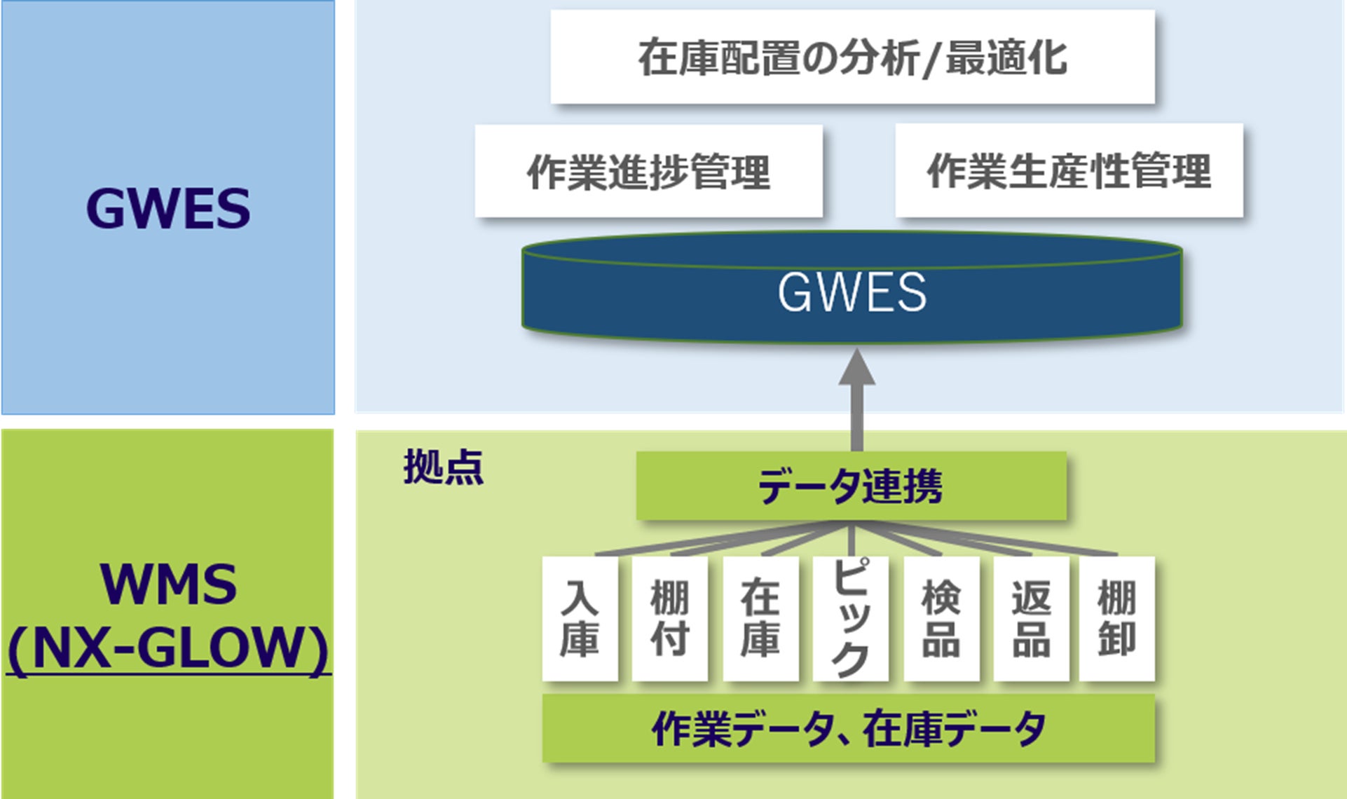 日本通運では自社のWMSである『NX-GLOW』に、『GWES』の業務進捗管理(PA)、作業量分析(WA)、在庫分析(IA)の可視化・分析のモジュール、そして在庫配置最適化モジュール(SO)を連携させ、新たな仕組みを構築しました。人員や在庫配置を最適化し、サービスレベル向上とコスト低減を実現します。