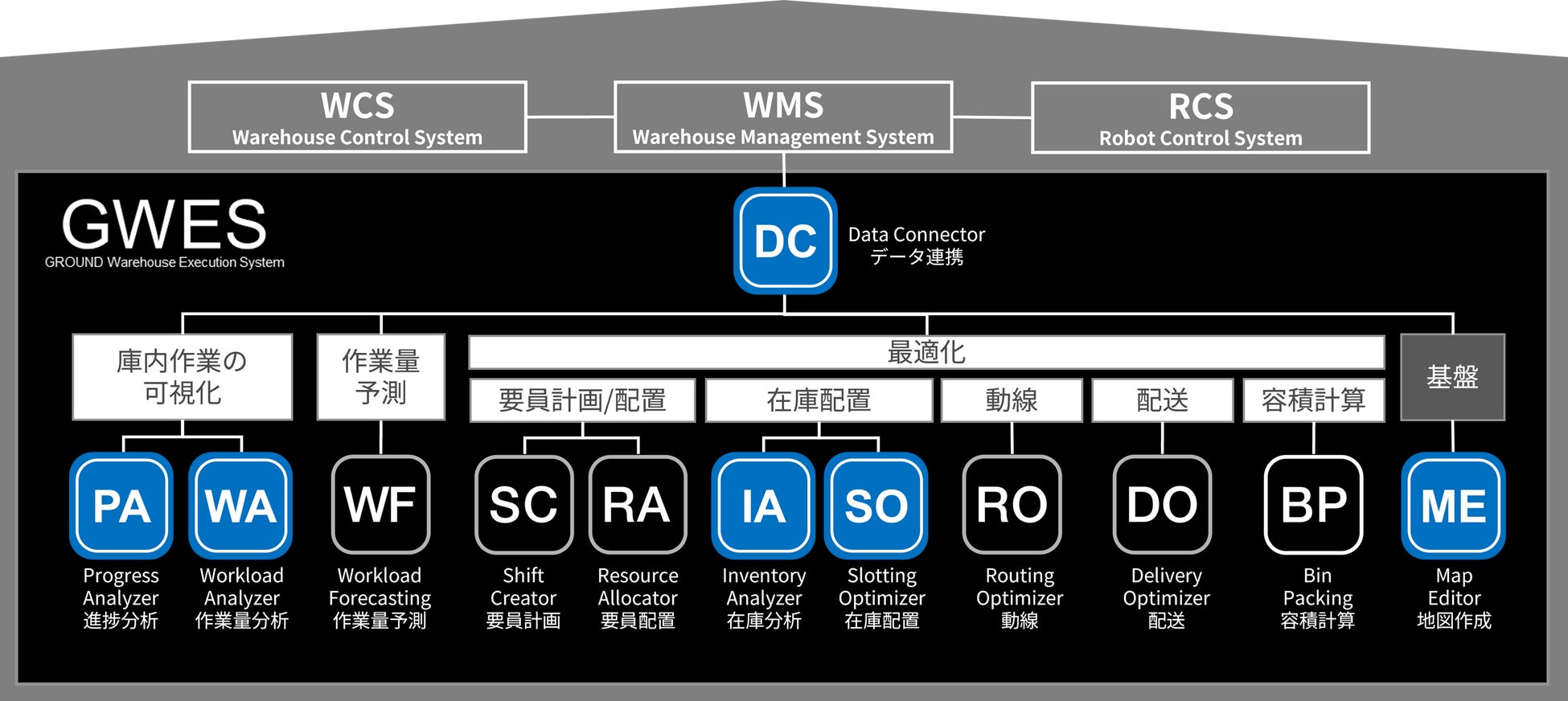 ※2 GWES:GROUND Warehouse Execution System、GROUNDが自社開発したWES (Warehouse Execution System: 物流施設運用管理システム)。ミドルウェアとなる共通データ基盤と、AIを適用した各種機能モジュール群で構成されている汎用性・拡張性の高いパッケージシステム