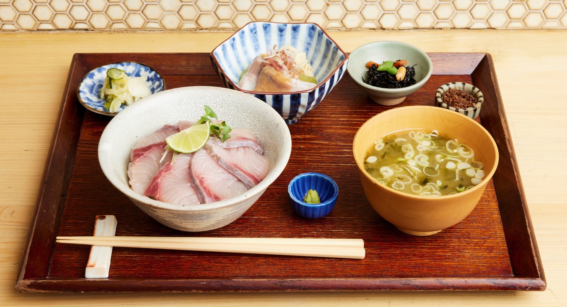 「黒瀬ぶり丼」は、栃木県産の干ぴょう・刻んだ大葉をきりっとした味わいの酢飯に混ぜ合わせ、その上に「黒瀬ぶり」をぜいたくに並べました。寿司酢の量を多くすることで、「黒瀬ぶり」の上品な脂をより引き立たせています。まずはそのままのおいしさを、お好みでわさび醤油・すだちを加えると味の変化が楽しめます。
