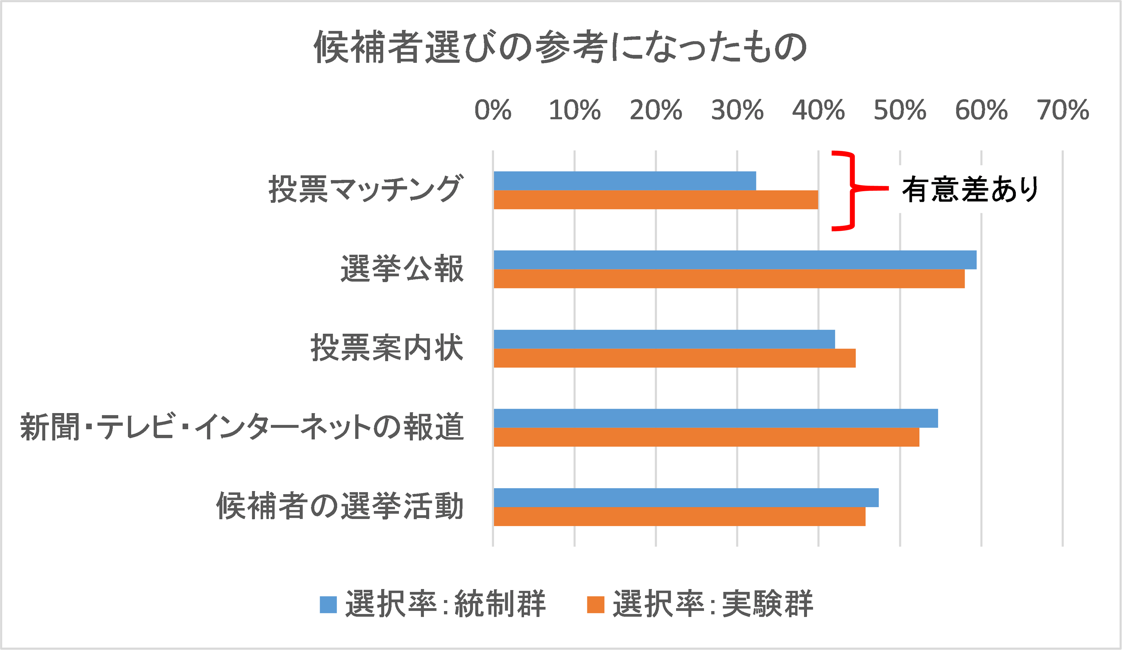 上記②と同様に、投票マッチングは候補者選びの参考にもなっています。マッチング結果を見ない統制群では32.3%が参考になったと回答したのに対して、マッチング結果を見た実験群では40.0%が参考になったと回答し、両者では統計的に有意な差がみられました。