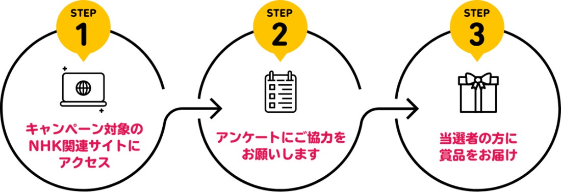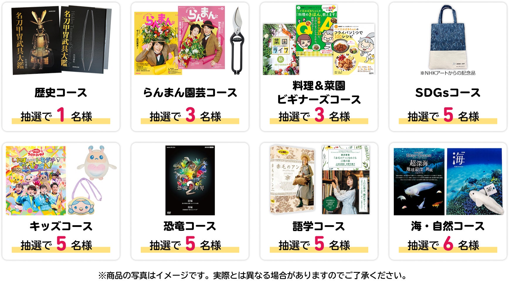 キャンペーン期間中、対象となるNHKグループのサイトを訪れ、アンケートにご回答ください。アンケートに回答いただいた方の中から抽選で33名様にNHK関連の人気商品をプレゼントします。(応募したいコースをアンケートでご選択ください)。