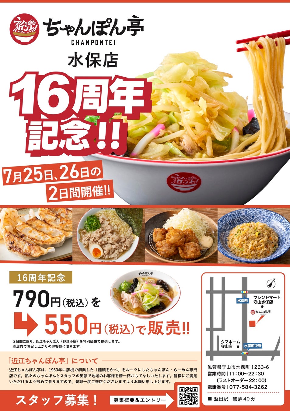 【近江ちゃんぽん亭】「 近江ちゃんぽん亭水保店16周年記念祭開催!」