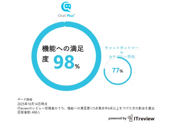 「ITreview」上でも、チャットボットルールカテゴリにおいて98%の機能満足度を獲得しており、多くのユーザーから確かな評価をいただいています。