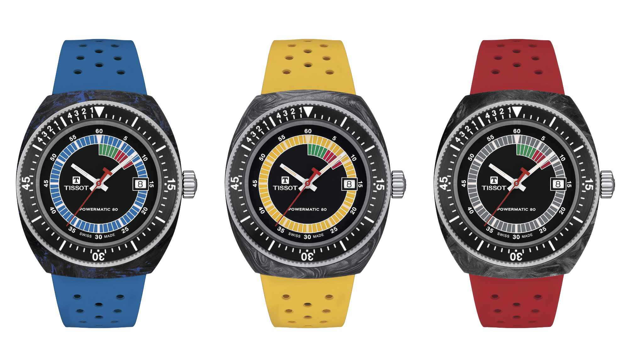 ティソ シデラルは、フォージドカーボンケースとダイバーズとレガッタの目盛りが刻まれたブラックPVDの逆回転防止ベゼルを採用し、ユニークで目を引くデザインとなっています。ダイアルには、マルチカラーの夜光塗料およびグリーンとレッドのレガッタカウントダウンゲージデザインが施され、70年代のレトロな美学を表現し、そのスタイルとスピリットに華を添えています。30気圧(300m)の防水性能を備えたシデラルは、さまざまなアウトドアアクティビティやイベントに対応する万能なウォッチです。