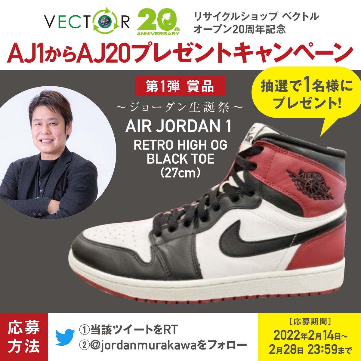 リサイクルショップ「ベクトル」1号店がオープンしてから20周年を迎えました。日頃のお客様への感謝の気持ちを込めて、1年間を通じ「Air Jordan1」から「Air Jordan20」までをプレゼントするキャンペーンをジョーダン村川のTwitterで開催します。