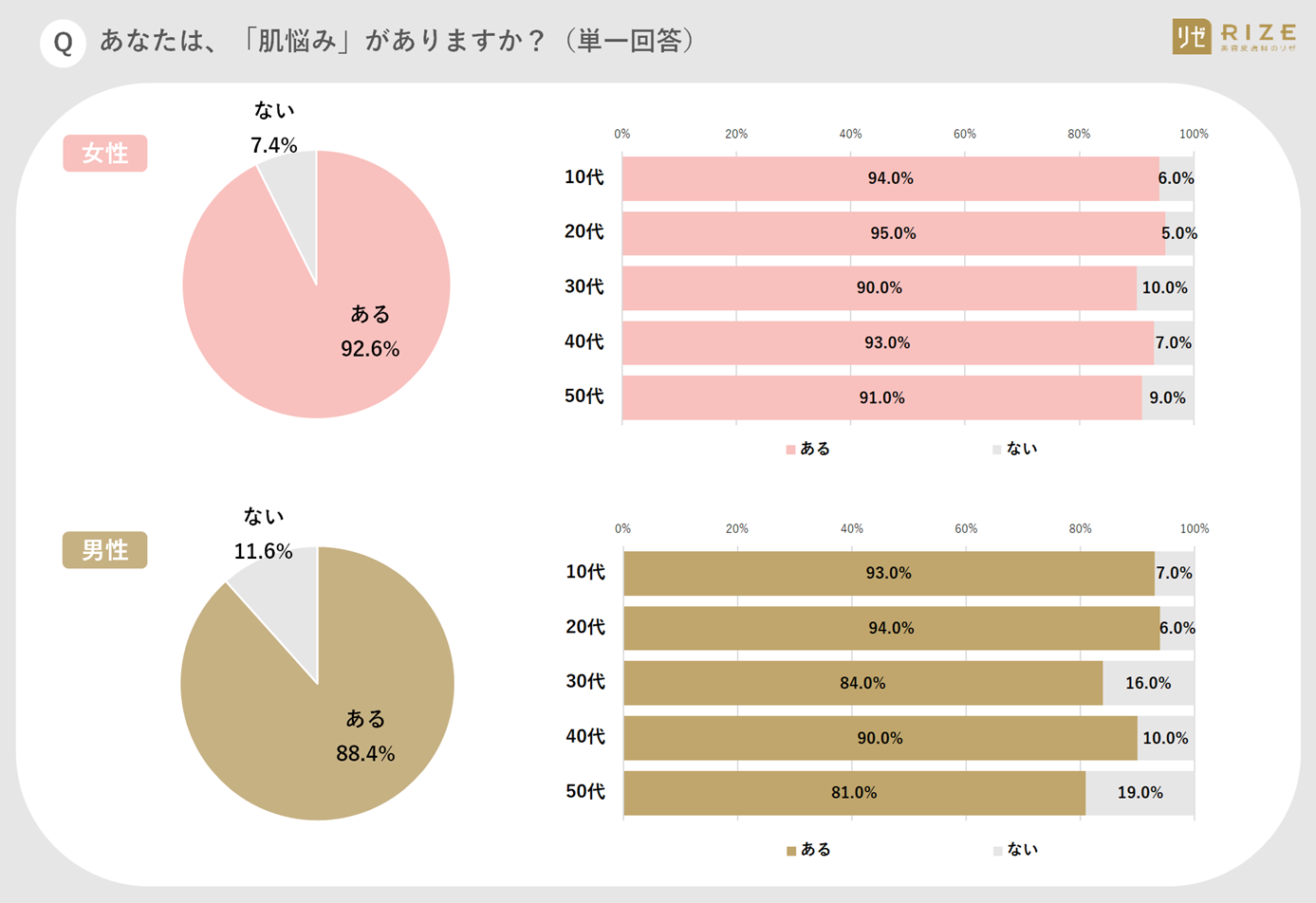 そこで、創業14年目で初となる「スキンケア治療」の導入を2024年1月4日(木)より開始する、全国26院展開する医療脱毛専門院『リゼクリニック』(医療法人社団風林会/東京都新宿区、総院長:赤塚正洋)では、若年層からミドル層までの10~50代男女1000名(各世代100名)を対象に【性別・世代別「肌の悩み」に関するアンケート調査】を実施(対象期間:2023年11月24日~26日の3日間・インターネット調査)。