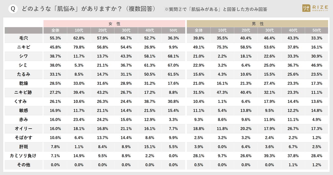 抱える肌の問題は「性別と加齢(世代)によって大きく異なる」ことが分かりました。