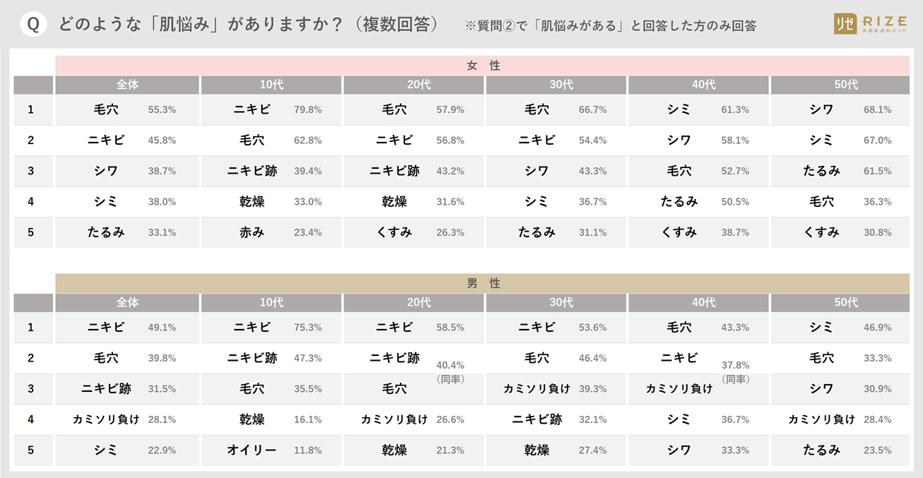「女性」に関しては、10~20代はニキビや毛穴などの「肌トラブル」が中心でしたが、30代以降はシミ・シワ・たるみといった「肌老化」の悩みへ変化。一方「男性」の場合、10~40代までずっと悩まされる「ニキビ(跡)と毛穴」問題が顕著になり、40代以降になると「肌老化」の悩みも現れる結果に。