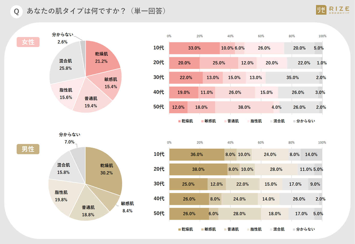 ①【あなたの「肌タイプ」は?】女性は「混合肌(25.8%)」、男性は「乾燥肌(30.2%)」が最も多い結果に