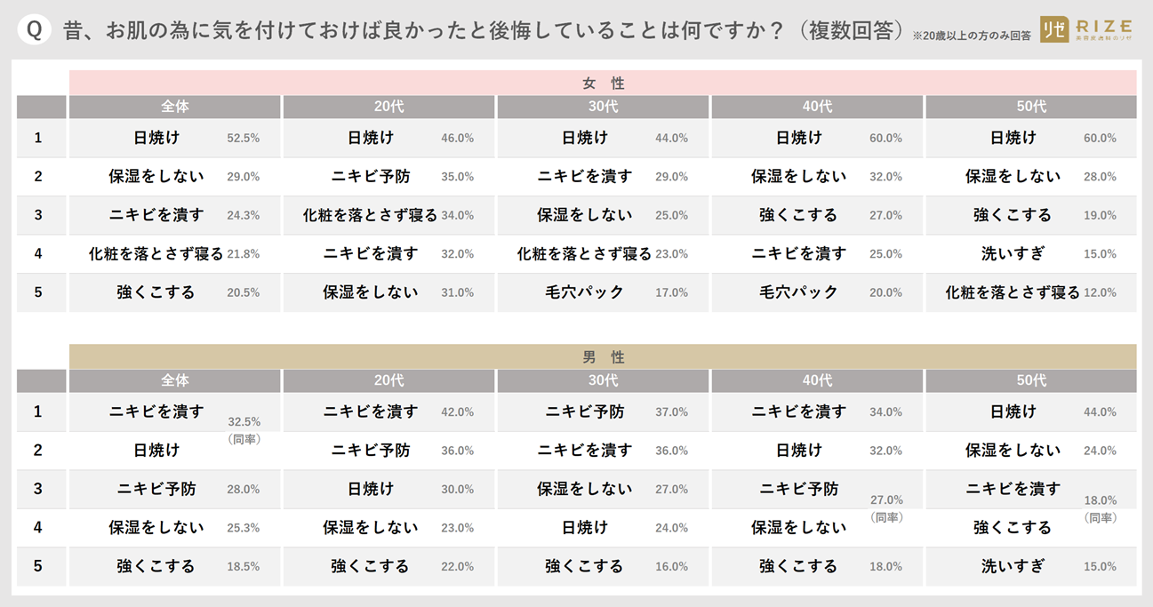 「男性」の場合、20~30代の4割が「ニキビを潰す」「ニキビ予防」とニキビ関連での後悔を示す一方、40~50代では「日焼け」への後悔と、若いときの流行の代償が顕著に表れる結果に(40代:32.0%、50代:44.0%)。