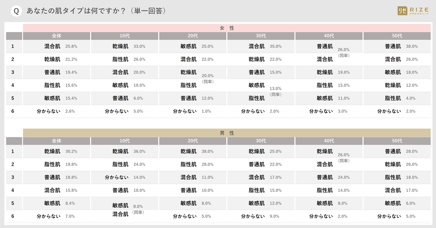 女性は「混合肌(25.8%)」、男性は「乾燥肌(30.2%)」が最多回答に。