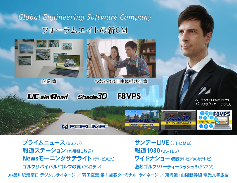 株式会社フォーラムエイト(本社:東京都港区港南2-15-1、社長:伊藤裕二、URL:https://www.forum8.co.jp)は、2022年2月1日より、パックン(パトリック・ハーラン氏)出演テレビCMの新シリーズを各局で放映いたします。今回は2編のエピソードを通して、パックンがUC-win/Road、Shade3D、F8VPS(FORUM8バーチャルプラットフォームシステム)とFORUM8を紹介をします。