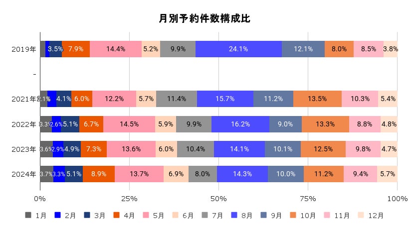 一年通した総予約件数を100%としたとき、繁忙期と呼ばれる7-9月の予約件数構成比は2023年の34.6%から2024年は32.3%と同水準で推移しました。