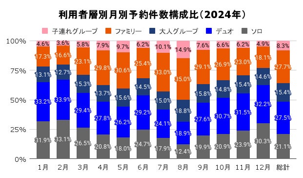 予約における利用者層別構成比も2023年と同様の動きを見せ、ソロ・デュオ利用で全体の半数近い48.6%を占めています。