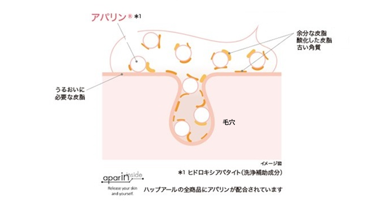 「ハップアール」は、サンギのコア技術である身体への親和性の高い成分「ハイドロキシアパタイト」の持つ吸着性能を活かした肌専用アパタイト「アパリン」※2を配合したスキンケアブランドです。洗浄補助成分としての高い機能を持つアパリンは、肌のダメージを引き起こすとされる3つの要因(①余分な皮脂、②酸化した皮脂、③古い角質)を選択的に吸着し、除去します。肌本来の保湿に必要な皮脂を残してくれるので、美しい素肌作りをサポートします。