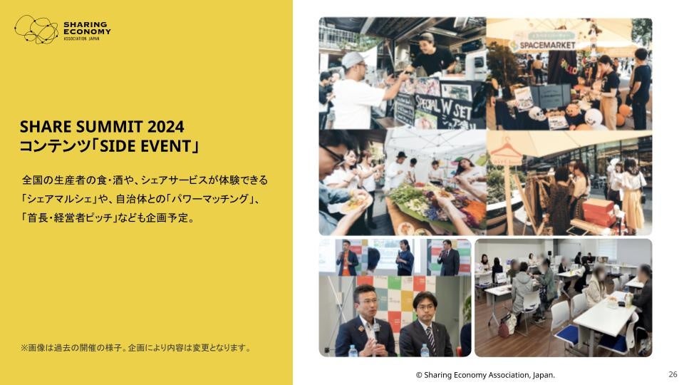 ③全国の生産者の食・酒やシェアサービスが体験できる「シェアマルシェ」、全国約5か所での自治体や事業者のシェアの取り組みの視察ツアーなどのサイドイベント。