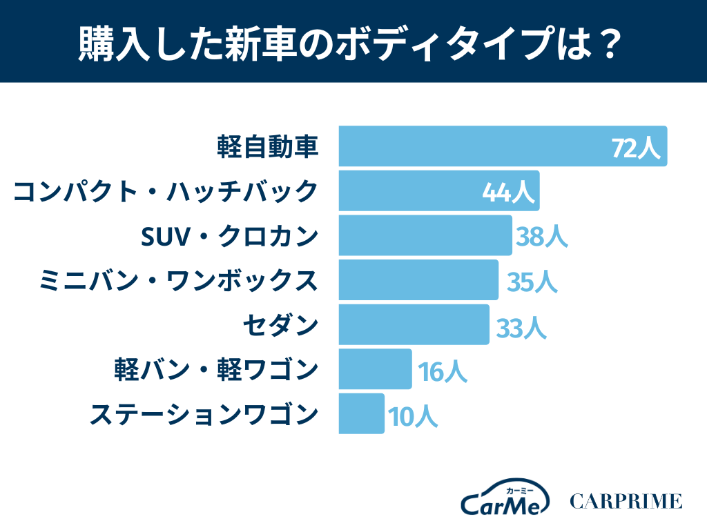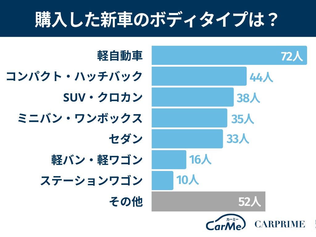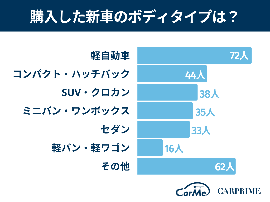 購入した新車のボディタイプでは、軽自動車が72人(24%)で最多になりました。新車購入の価格帯を考慮すると、比較的安い軽自動車が人気なのも頷けます。