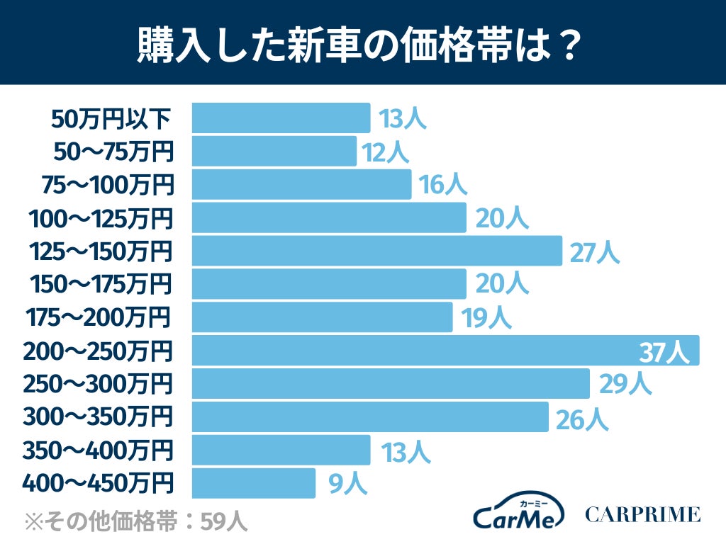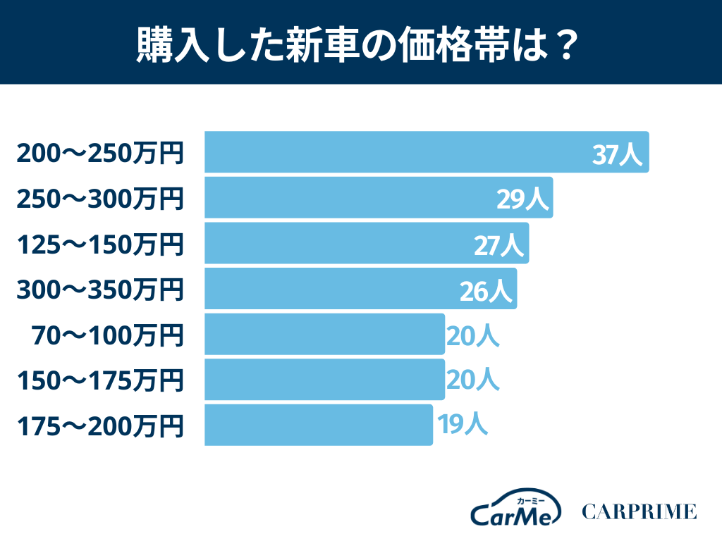 新車購入の価格帯として一番回答が多かったのは、200〜250万円の37人(12.3%)でした。2番目に多かったのは、250〜300万円の29人(9.7%)です。