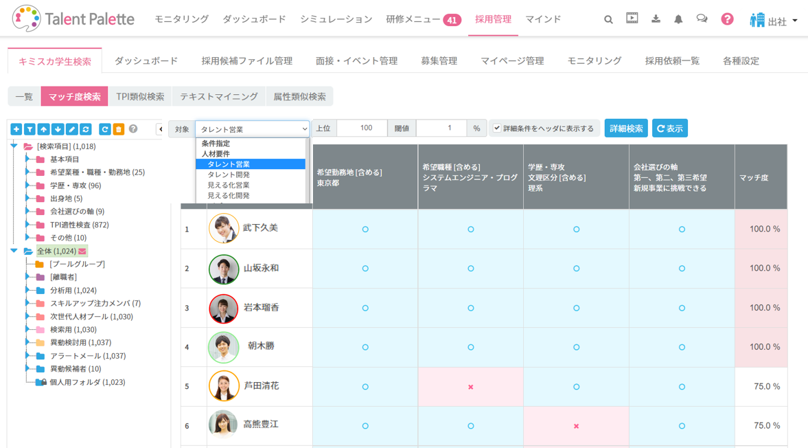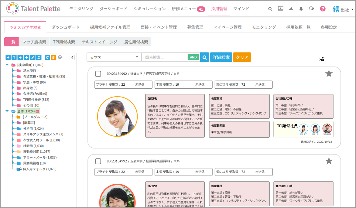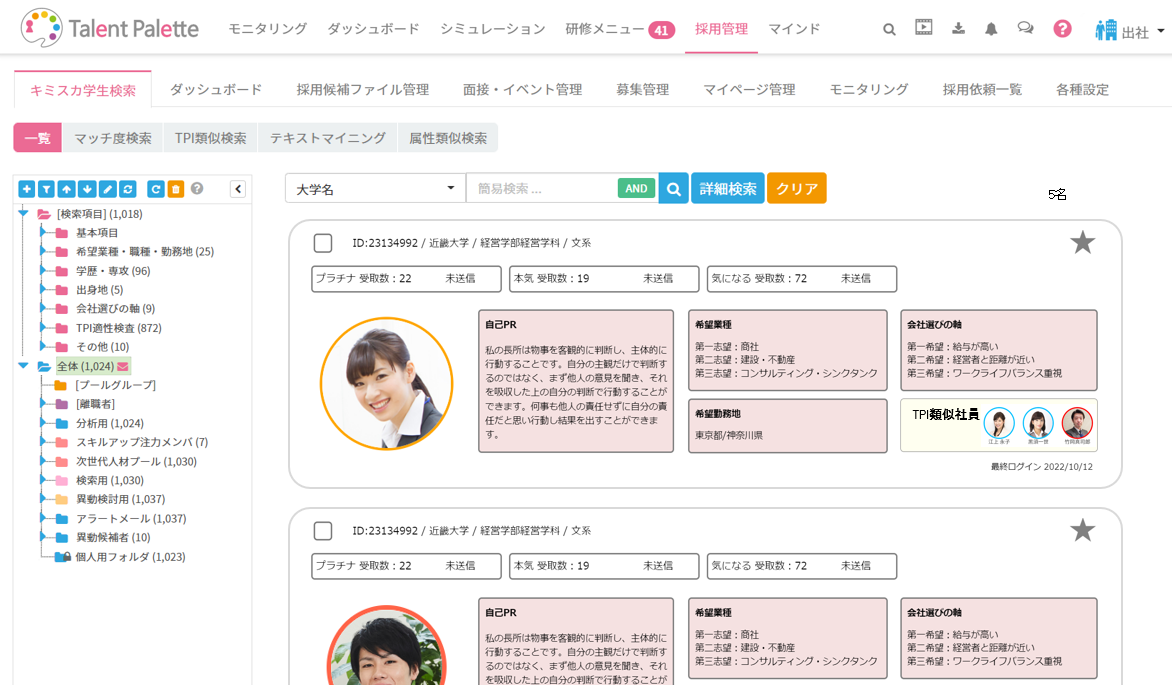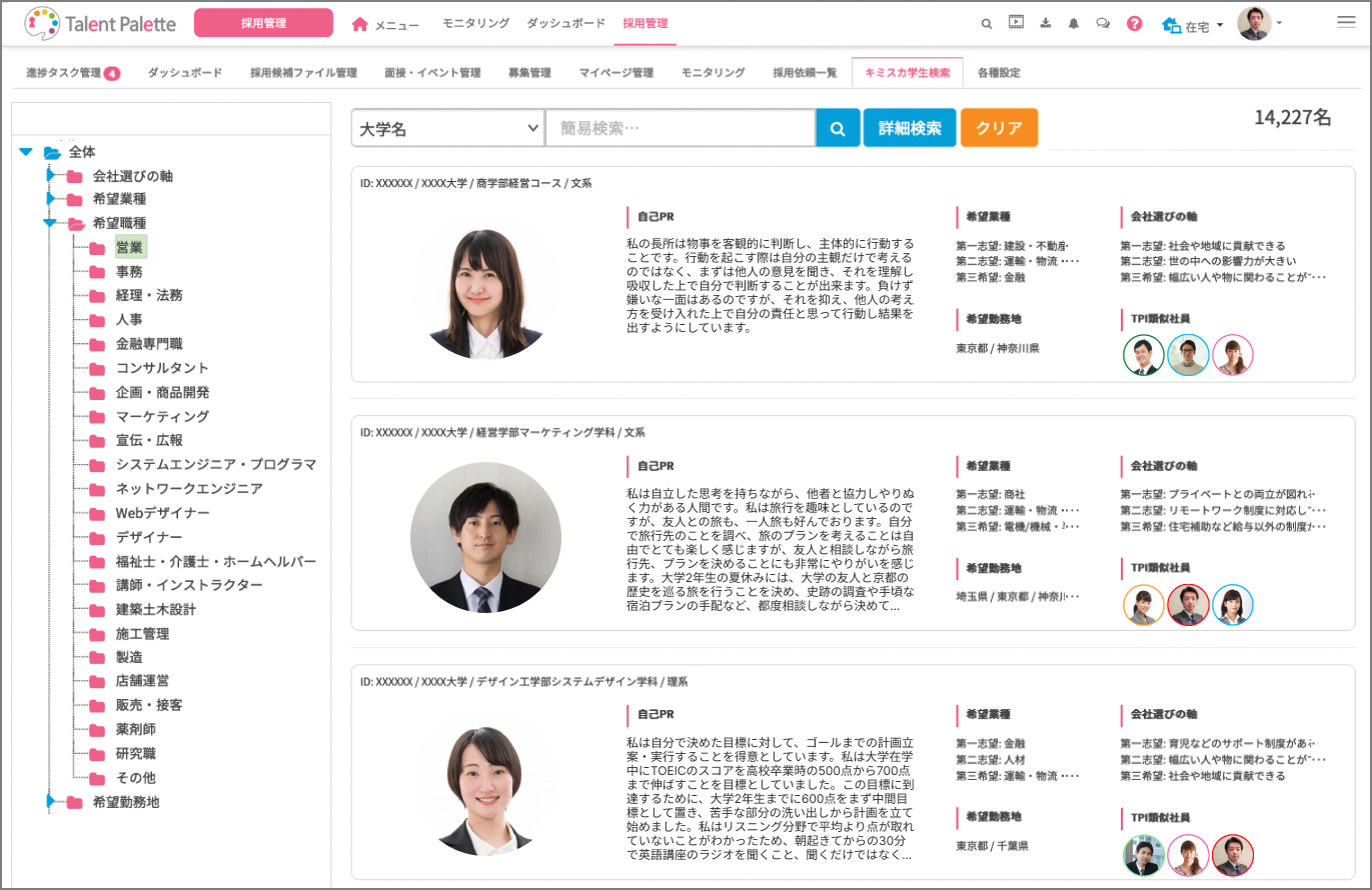 ● 学生の基本情報とタレントパレット適性検査(TPI)による検索(キミスカ連携機能)