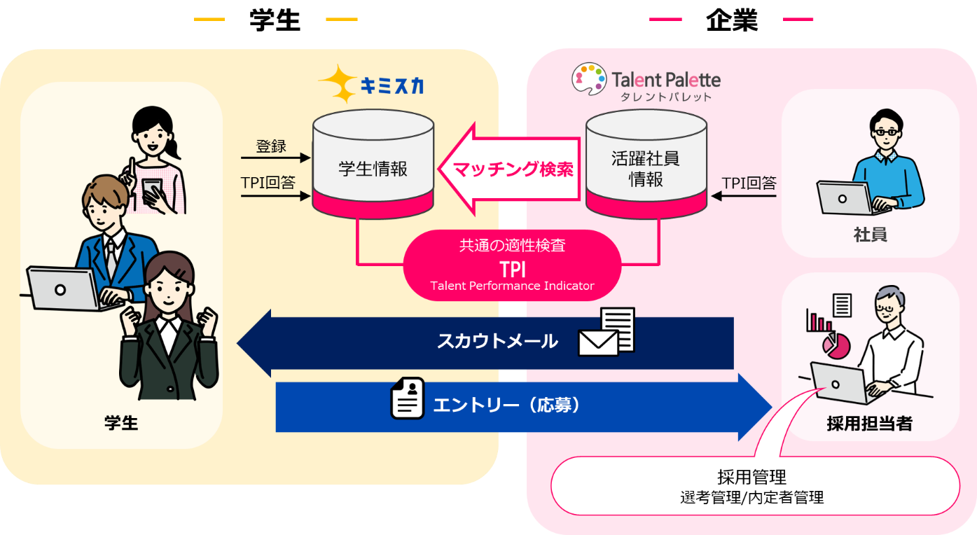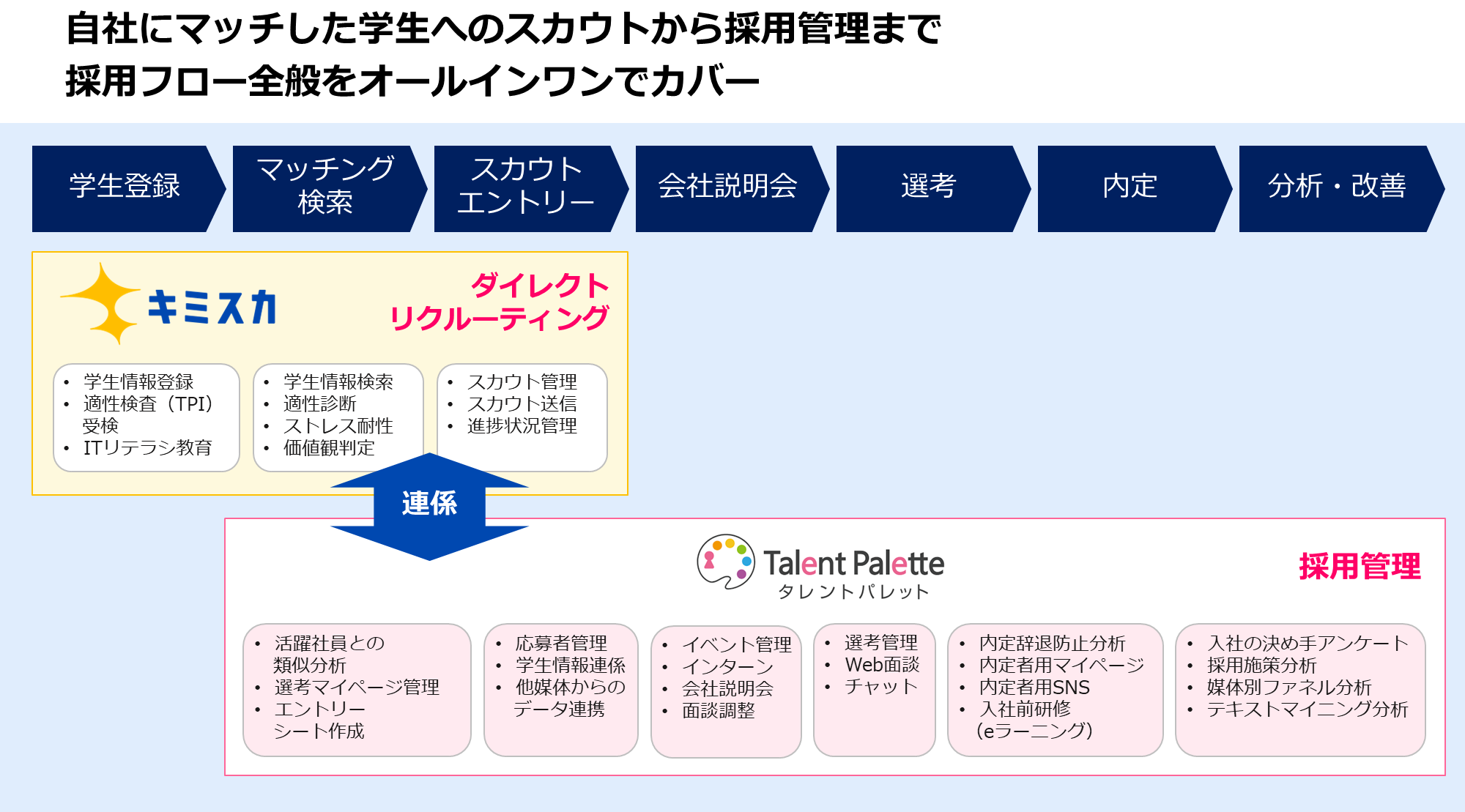 今回のキミスカとの連携により、タレントパレット上に蓄積された活躍社員の適性検査傾向やスキル特性、価値観などと、キミスカに登録された就職活動中の学生のデータをマッチングさせることにより、面接官の経験や勘に依存しない、データに基づいた、より自社で活躍できる学生に効率的にスカウトすることが可能となります。