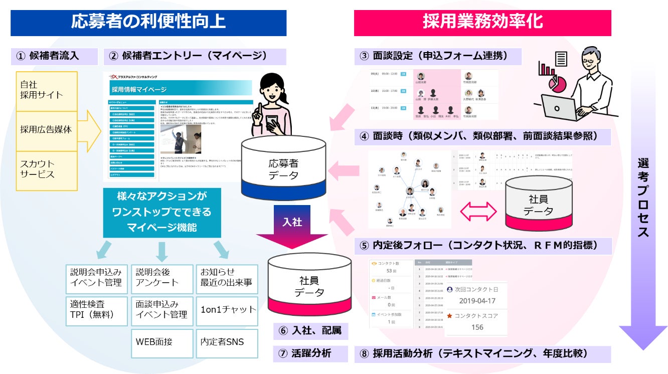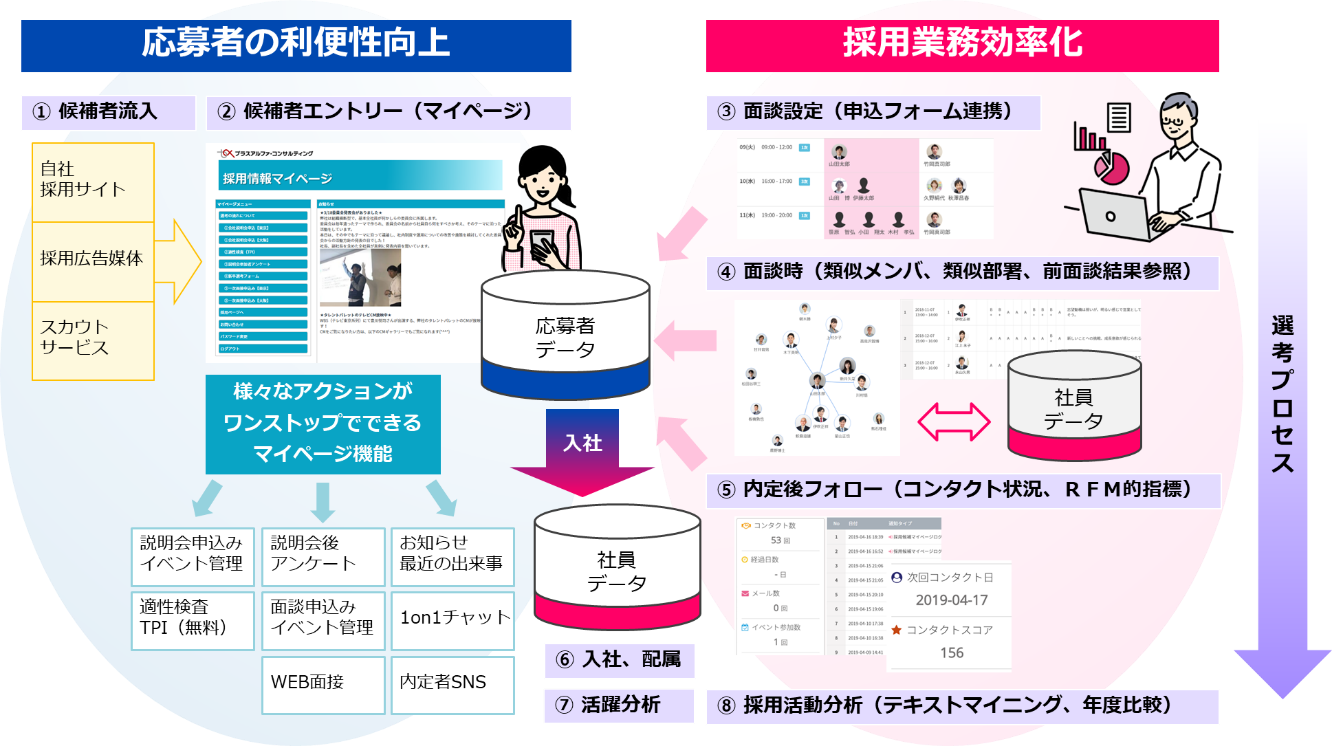 採用管理機能では、エントリー学生とのやりとりを行うマイページやチャットの設定、説明会のスケジュール管理、面談設定や選考管理、内定者フォローといった一連の採用業務の効率化が実現できると同時に、年度をまたいだ過去の応募者・内定者のデータも蓄積できることで、母集団形成から内定承諾に至る各種施策の効果測定を分析することで、採用戦略の振り返り・改善に活かすことが可能となります。