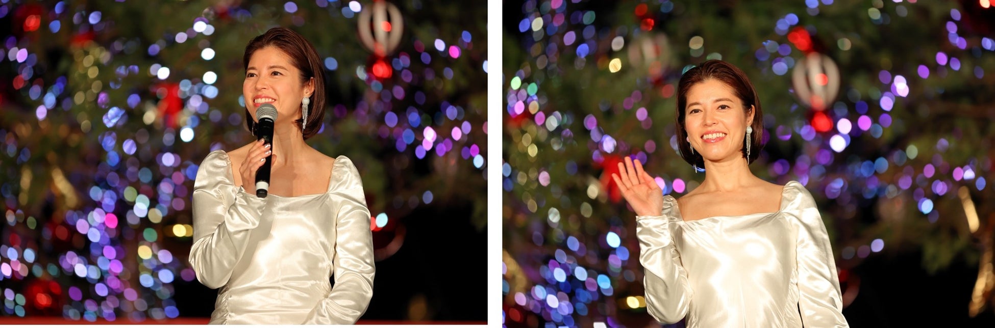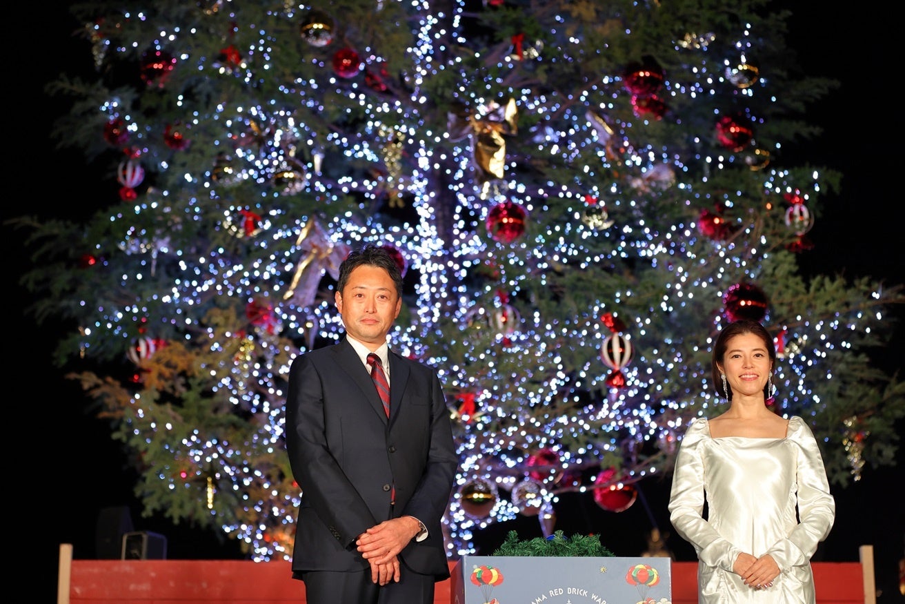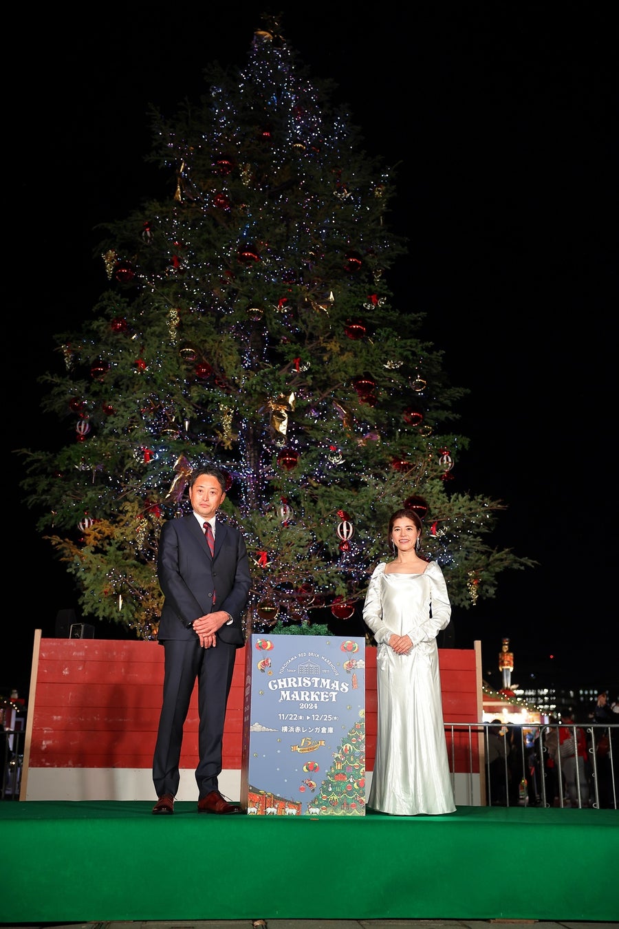 待ちわびた点灯にワクワクした表情を見せながら、開催初日に合わせて会場に集まったお客様の盛大なカウントダウンのもと、株式会社横浜赤レンガ 代表取締役 岩﨑求起と息を合わせて点灯。その迫力と煌びやかさに思わず「わあ~綺麗~!」と大感激。会場内のシンボルとして、約2万球の LED で照らされた高さ約10mのモミの木を見つめ、「幹から枝の先まですべてが光り輝いていてとっても綺麗です!横浜は有名な方が多いのでなかなかこのような大役を任せていただくことがなく、人生初の点灯式だったのですが、本当に幸せです!」とコメント。