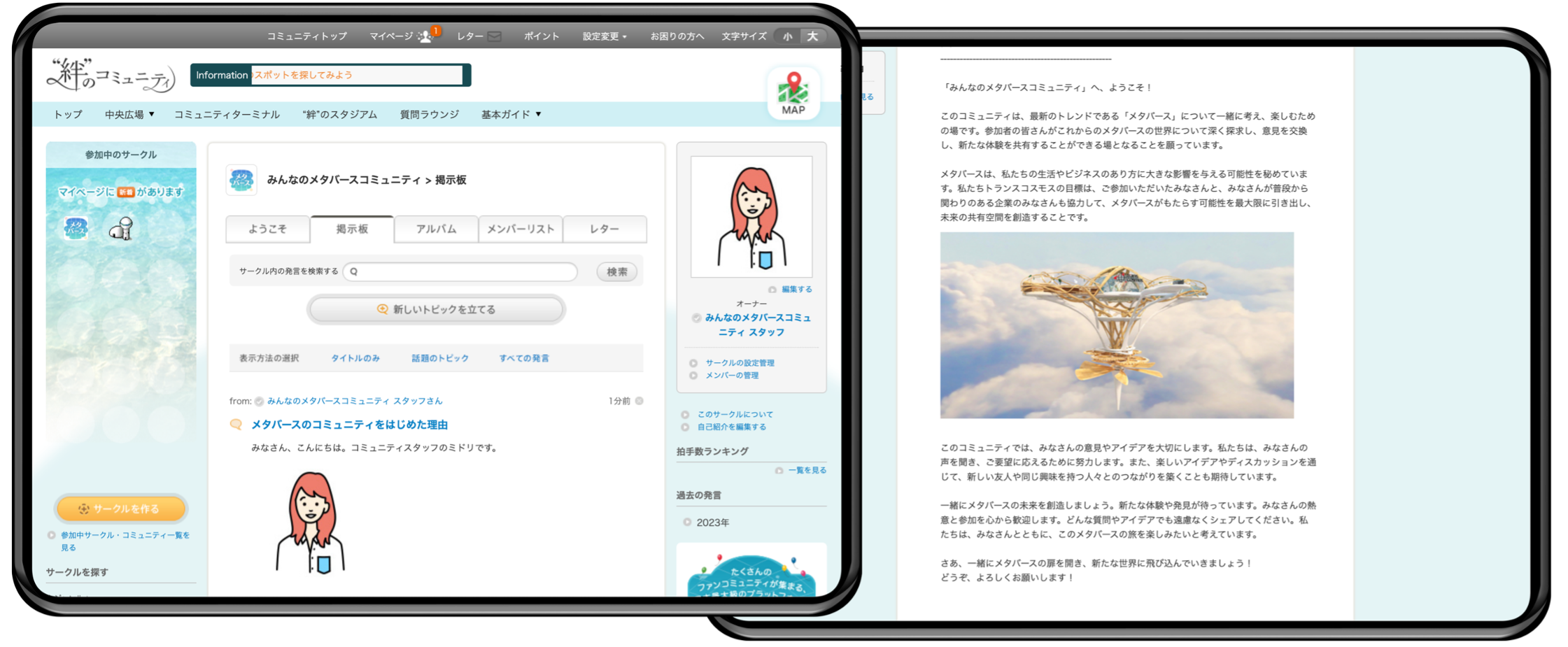 メタバースを日常的に楽しんでいる方から、「メタバースって何?」という方まで、どなたでも参加できるファンコミュニティです。トークテーマに回答したり、他の参加者の体験談を読んだり、参加者同士の交流を楽しみながらメタバースについての理解を深めることができます。