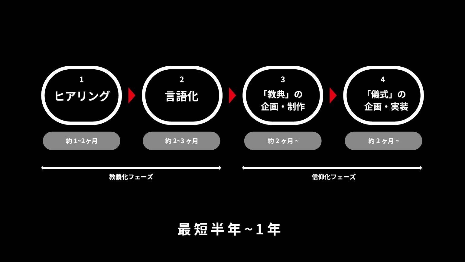 組織の暗黙知をパーパスとして言語化する「教義化フェーズ」と、パーパスを組織のカルチャーになるまで浸透させる「信仰化フェーズ」を通じて、パーパスを “宗教的熱狂” へと昇華させます。