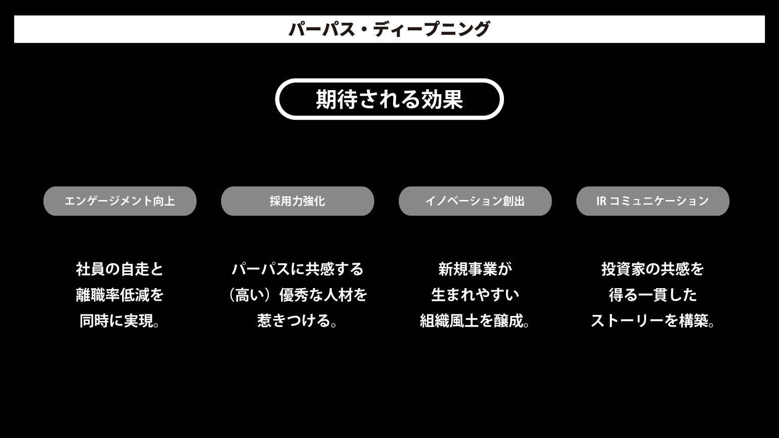 パーパス・ディープニングによって、日本の企業の変革、本当に価値ある企業の成長に貢献していけるよう、社として全力を尽くします。やっていこう。」