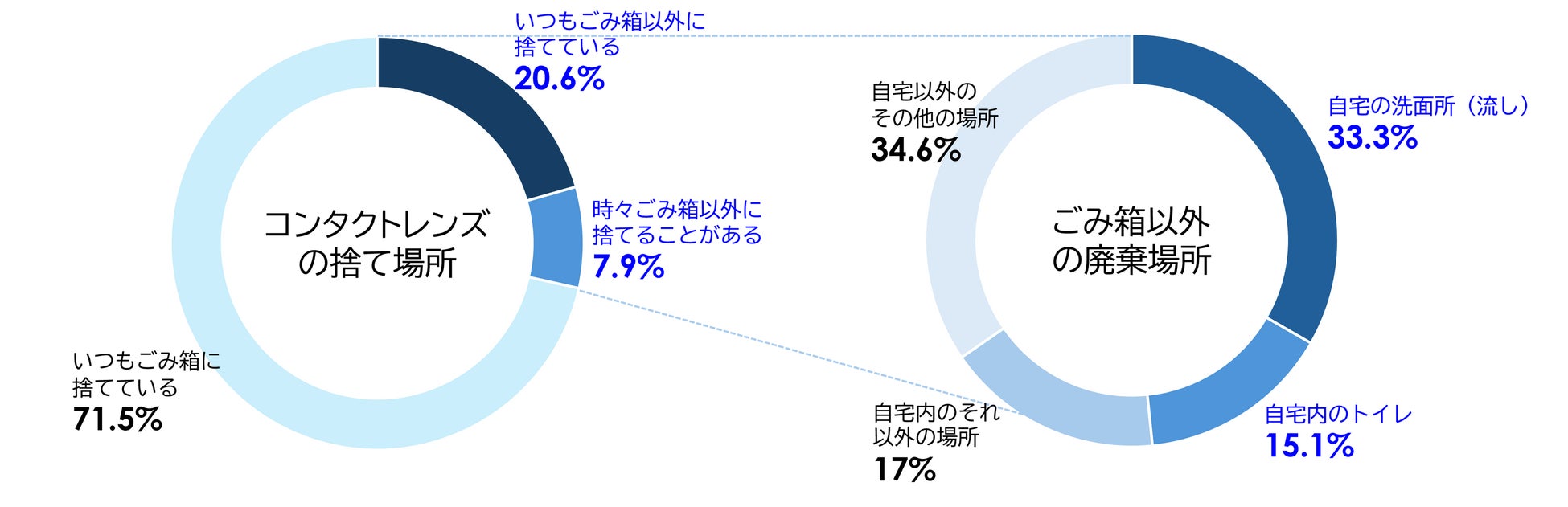 日本でも2019年にコンタクトレンズ協会が行った「コンタクトレンズ消費者実態調査」(※-3)によると、回答者の約28%の人が使用済みのコンタクトレンズをいつも、ないしは時々ごみ箱以外に捨てていて、その内の48%の人が、自宅の洗面所やトイレに流していると回答しています。
