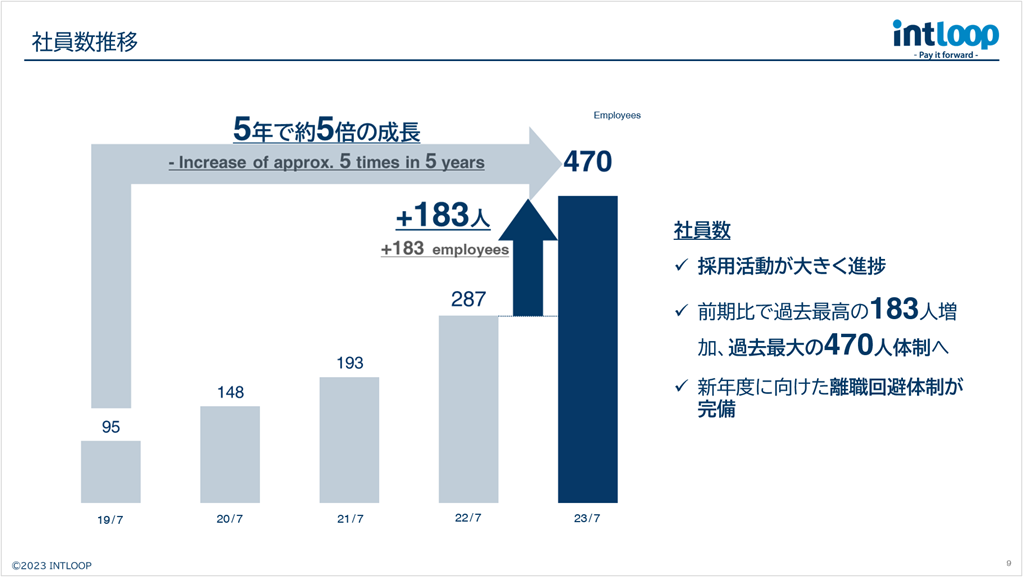 採用活動が大きく進展し、社員数が前期比で過去最高の183名増加したことで、過去最高人数の470名体制となりました。2019年7月期と比較して、5年で約5倍の規模に成長しています。