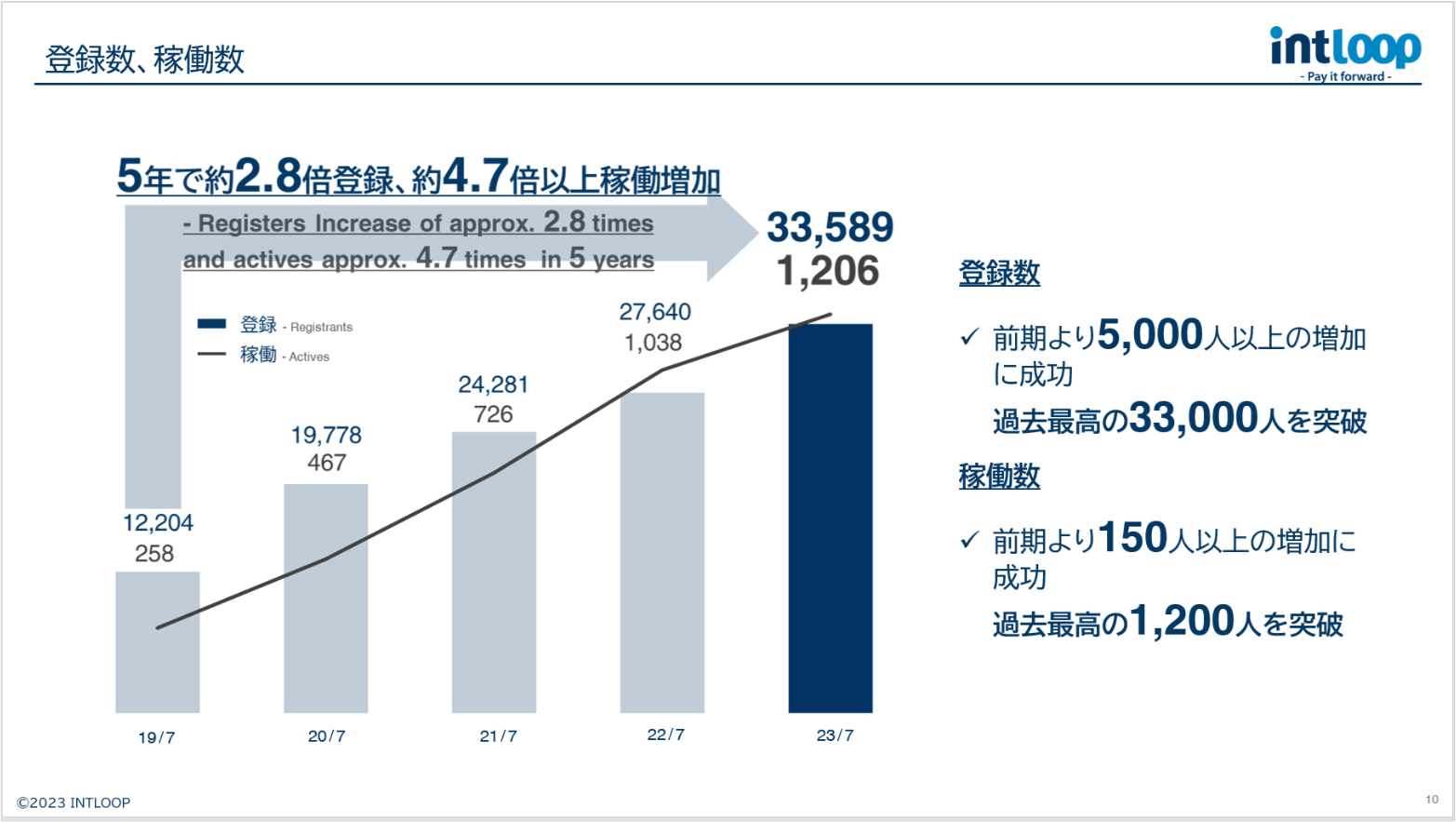 プロ人材登録者数は、前期比5,000名以上の増加に成功し、過去最高の33,000名を突破しました。2019年7月期と比較して、5年で登録者数は約2.8倍、稼働数は約4.7倍に増加しています。採用したデリバリー社員とのハイブリッドシステム*により、稼働率の改善に至っています。