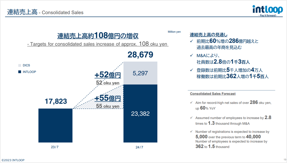 来期計画として、売上高は前期比60%増の286億円超えとなり、過去最高の年商を見込んでおります。また、社員数は今回のM&Aにより1,300人程度となります。登録者数は40,000人超え、稼働人数は1,500人超えを想定しております。