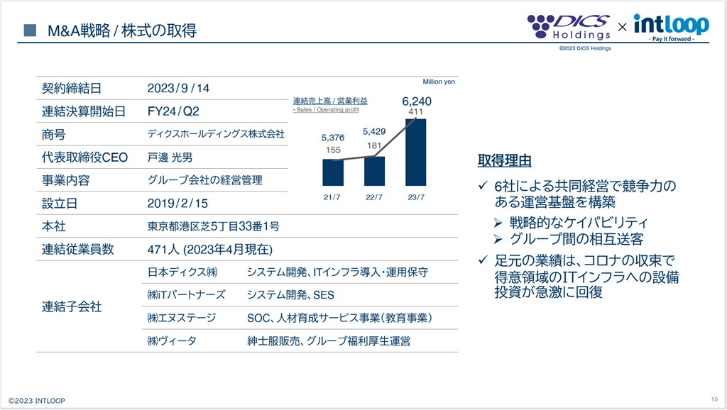 当社は、ディクスホールディングス株式会社(以下、ディクスHD)の株式を取得致しました。ディクスHDとの共同経営を実現することで、6社グループの相互送客に加え、アップストリームからダウンストリームにおける戦略的なケイパビリティを形成することで、付加価値の高い事業運営基盤が構築されると見込んでおります。今回の株式取得のみならず引続き継続的なM&A活動を推進することで、人と企業の成長が循環する社会を実現すると同時に中期成長戦略の目標でもある売上高1,000億円をいち早く実現できるよう邁進してまいります。