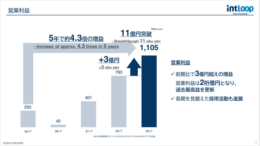 営業利益は、前年比で3億円の増益となり、同時に10億円を突破する過去最高益を記録しています。2019年7月期より5年で、約4.3倍の増益となりました。