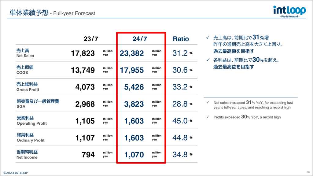 2024年7月期単体計画として233億円(+31.2%)、営業利益16億円(+45.0%)、当期純利益として10億円(+34.8%)と前期に引き続き過去最高益を目指しいてまいります。